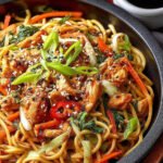 Die Aromen von Asiatischen Nudeln mit Hähnchen tanzen auf der Zunge wie ein gut einstudierter Cha-Cha-Cha. Die Kombination aus zartem Hähnchen, knackigem Gemüse und würziger Sauce ist nicht nur ein Fest für den Gaumen, sondern auch ein wahres Fest für die Augen.