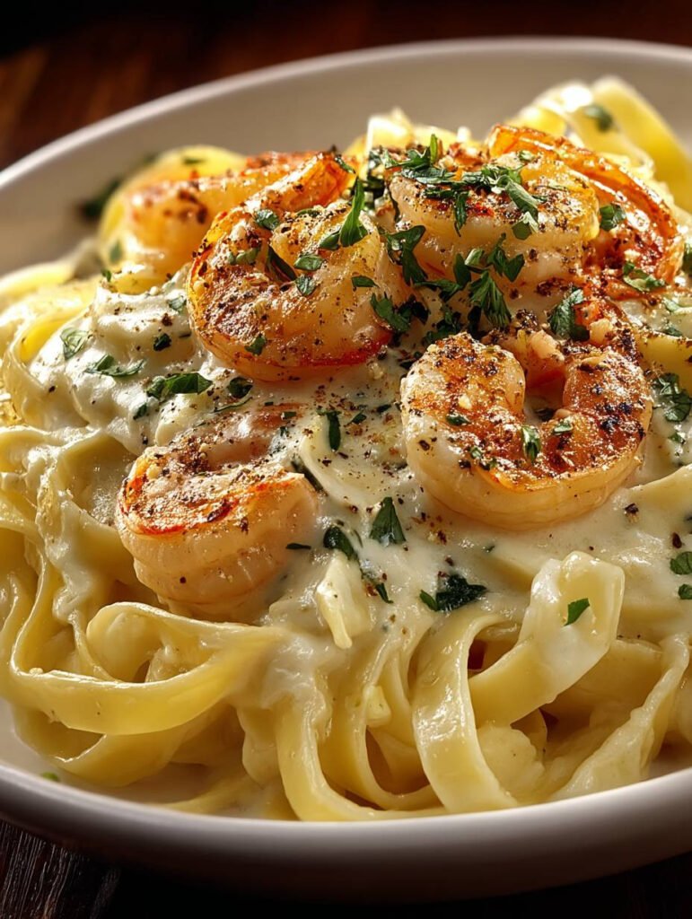 Die cremige, samtige Textur von Fettuccine Alfredo mit Garnelen wird Sie sofort in ihren Bann ziehen. Stellen Sie sich vor, wie die zarten Garnelen in einer reichhaltigen, buttrigen Sauce schwimmen …
