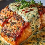 Richten Sie den zarten Lachs auf einem Teller an, löffeln Sie großzügig von der cremigen Sauce darüber und garnieren Sie alles mit frisch gehackter Petersilie. Servieren Sie es sofort – so bleibt der Fisch perfekt saftig!
