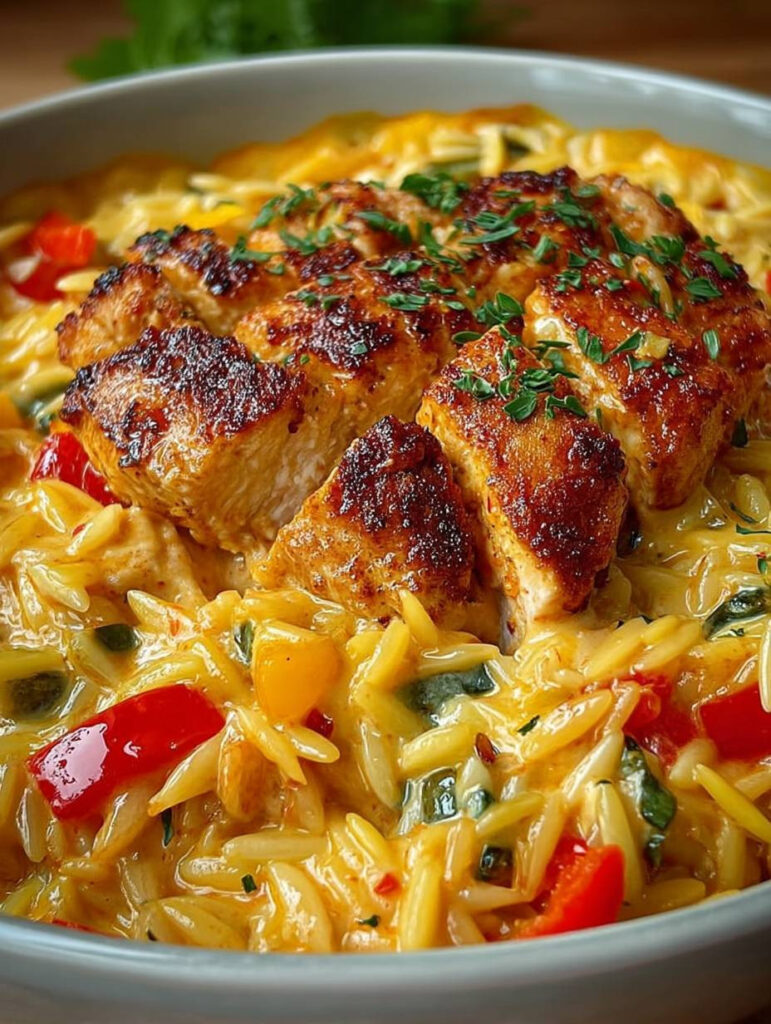 Die Aromen von gerösteter Paprika, cremigem Hähnchen und zartem Orzo tanzen auf der Zunge und schaffen ein Geschmackserlebnis, das einfach unwiderstehlich ist. Jedes Bissen dieses Gerichts ist wie eine Umarmung …