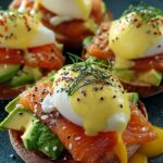 Eier Benedict mit Lachs & Avocado – ein Gericht, das wie eine Umarmung für deinen Gaumen ist! Die Kombination aus perfekt pochierten Eiern, cremigem Avocado und dem zarten Geschmack von Lachs wird dich in den siebten Himmel katapultieren. Ob zum Brunch oder als köstliches Mittagessen, dieser Genuss ist der Star auf jedem Tisch.