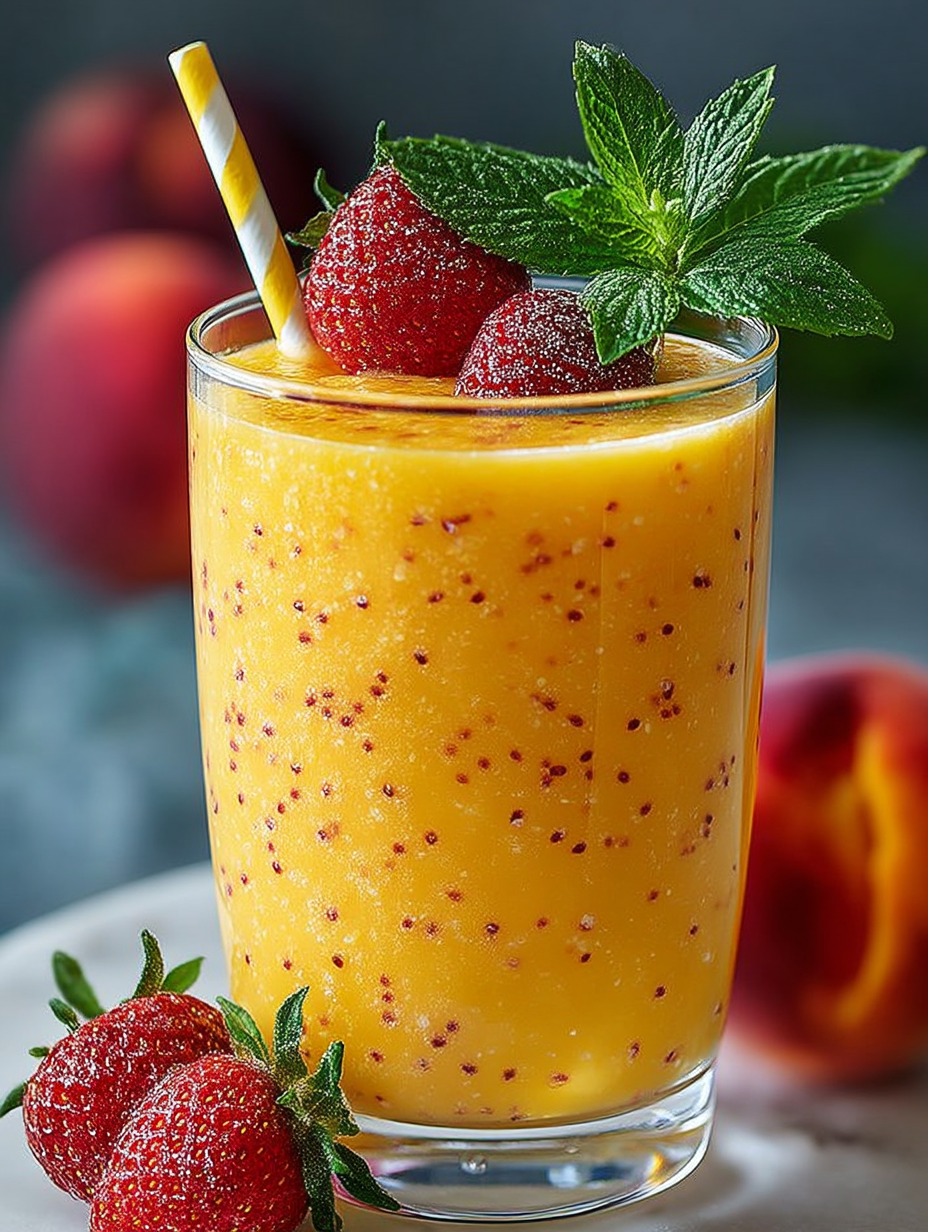 Den fertigen Smoothie gieße ich in Gläser und serviere ihn sofort, damit er schön frisch bleibt. Du kannst ihn mit frischen Minzblättern oder einer Scheibe Pfirsich garnieren, das sieht nicht nur toll aus, sondern schmeckt auch wunderbar.