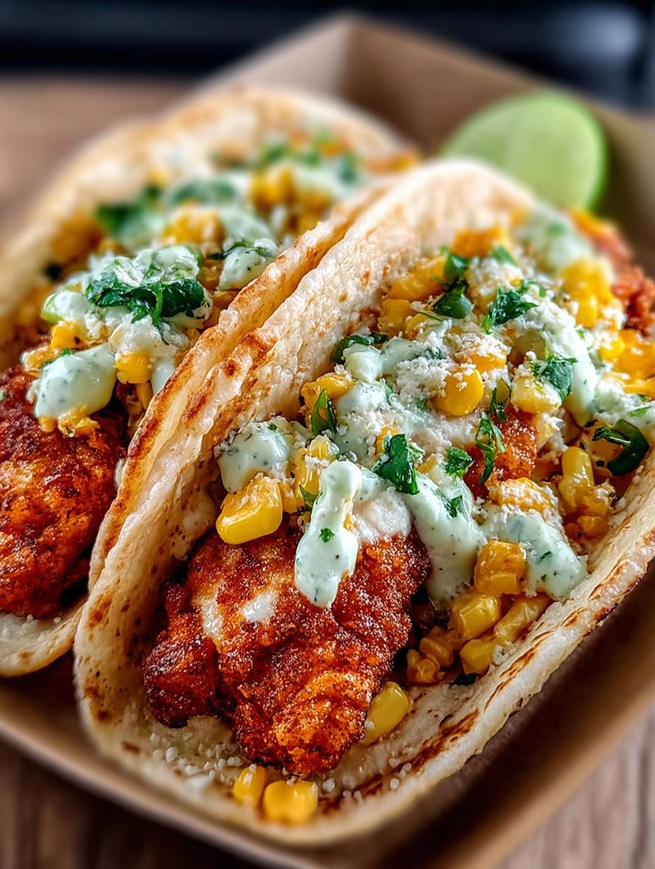 FRIED CHICKEN STREET CORN TACOS WITH JALAPEÑO LIME