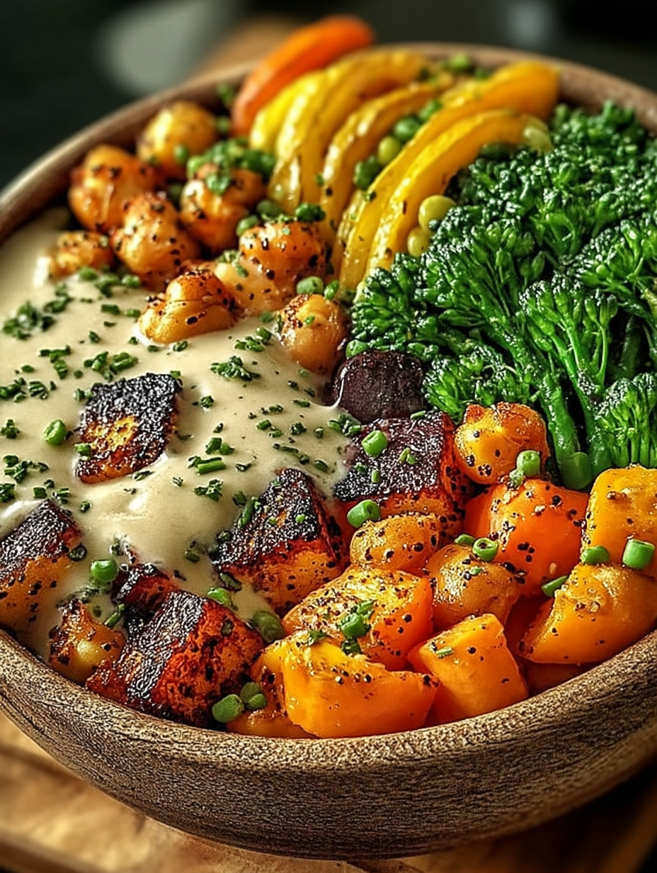 Geröstete Gemüse Kichererbsen Bowls mit Ahorn Dijon Tahini Dressing