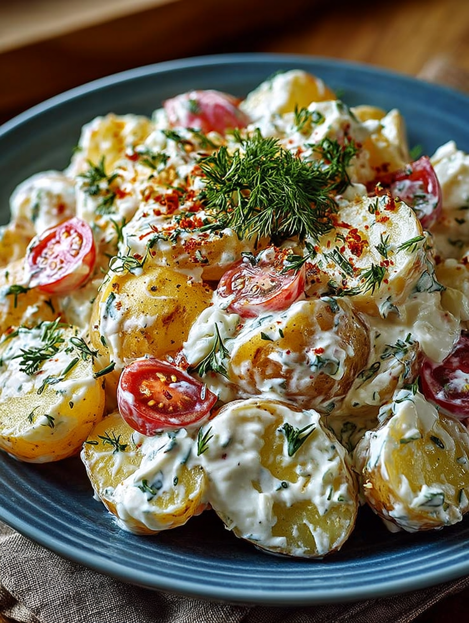 Dieser cremige Kartoffelsalat mit Joghurt ist eine leichte und leckere Alternative zum klassischen Mayonnaise-Salat. Er überzeugt durch frische Aromen, eine angenehme Säure und eine samtige Textur. Perfekt als Beilage zu Gegrilltem, Ofengerichten oder einfach solo.
