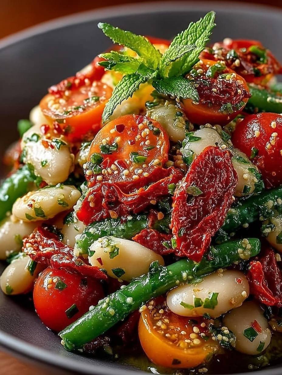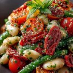 Die Aromen des marinierten Bohnen-Salats mit getrockneten Tomaten tanzen fröhlich auf der Zunge – knackige Bohnen, süße Tomaten und ein Hauch von frischen Kräutern vereinen sich zu einem Fest der Texturen. Stellen Sie sich vor, wie jeder Bissen eine Erfrischung ist, die Ihnen das Gefühl gibt, im Sonnenschein zu schlemmen, während die Sorgen des Alltags in den Hintergrund verschwinden.