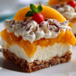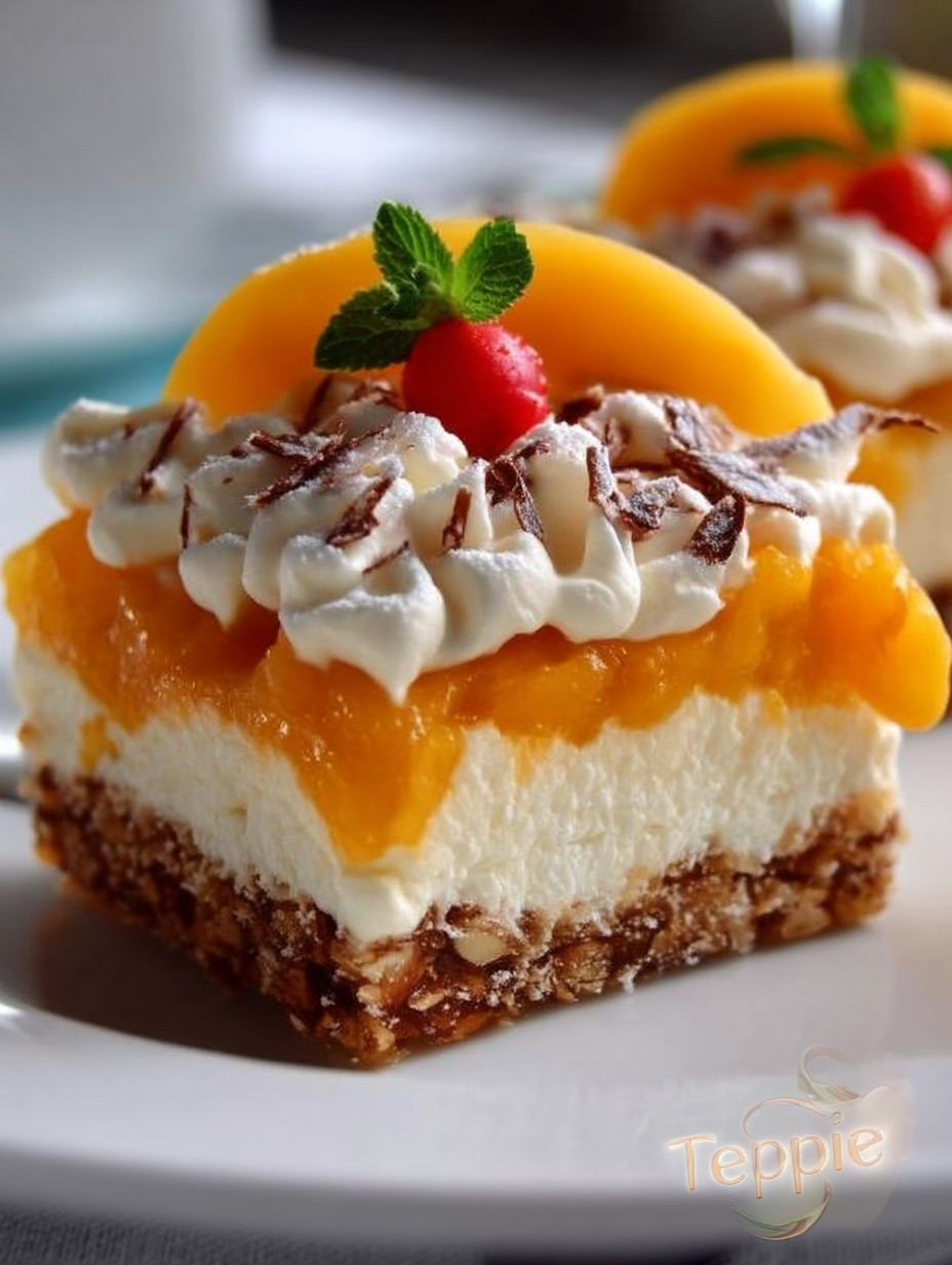 Garnieren Sie den fertigen Kuchen nach Belieben mit frischen Pfirsichen oder gehackten Nüssen für einen zusätzlichen Crunch! Servieren Sie ihn am besten kalt – so kommen die Aromen perfekt zur Geltung!