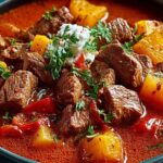 Lagern Sie das Gulasch in einem luftdichten Behälter im Kühlschrank, um die Aromen zu bewahren. Wenn Sie es wieder aufwärmen, tun Sie dies langsam bei niedriger Hitze, damit die zarte Fleischtextur erhalten bleibt und nicht austrocknet.