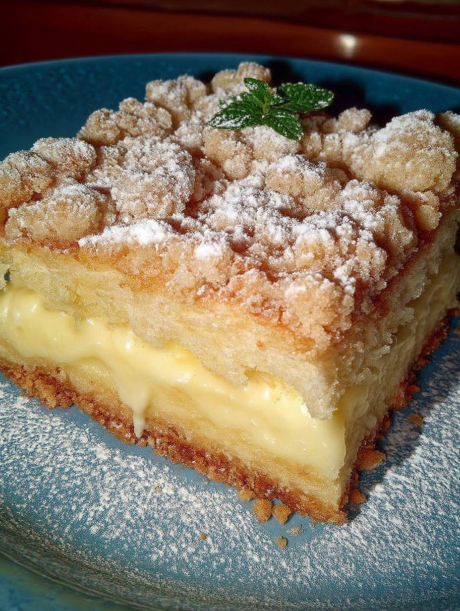 Ein Stück Streuselkuchen mit Vanillepudding, unglaublich lecker! Das ist nicht nur ein Kuchen – es ist eine Geschmacksexplosion, bei der die knusprigen Streusel auf der Zunge zergehen und die cremige Vanillefüllung deine Sinne umschmeichelt. Ein wahrer Hochgenuss, der jedem Bissen das Gefühl von Geborgenheit verleiht!