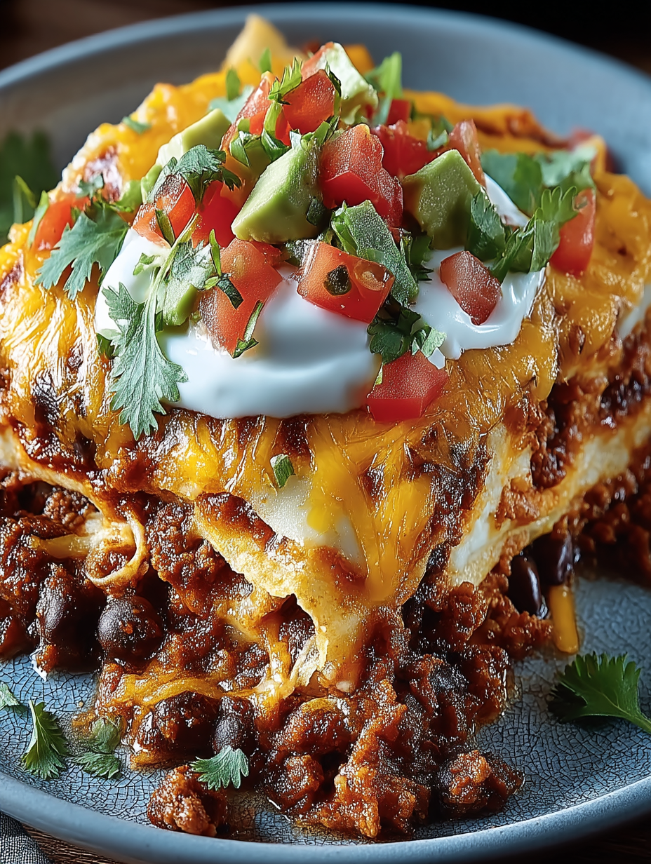 Lass den Taco-Auflauf kurz abkühlen und garniere ihn nach Wunsch mit frischem Koriander oder Petersilie. Er schmeckt hervorragend mit einem frischen Salat oder Reis als Beilage.