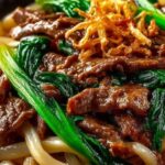 Dieses Rezept für Udon-Nudeln mit Rindfleisch, Pak Choi und Röstzwiebeln ist ein echter Hit in der Küche! Die Zubereitung ist einfach und schnell – sogar wenn Sie nach einem langen Arbeitstag nach Hause kommen. Das einzigartige Geschmacksprofil vereint herzhaftes Rindfleisch mit knackigem Gemüse und der unverwechselbaren Textur der Udon-Nudeln. Die Optik begeistert alle Gäste: Leuchtendes Grün des Pak Chois, goldene Röstzwiebeln und die satten Farben des Fleischs sorgen für ein Festmahl für die Augen. Und das Beste? Sie können das Gericht ganz nach Ihrem Geschmack anpassen – sei es durch die Wahl des Gemüses oder durch zusätzliche Gewürze!