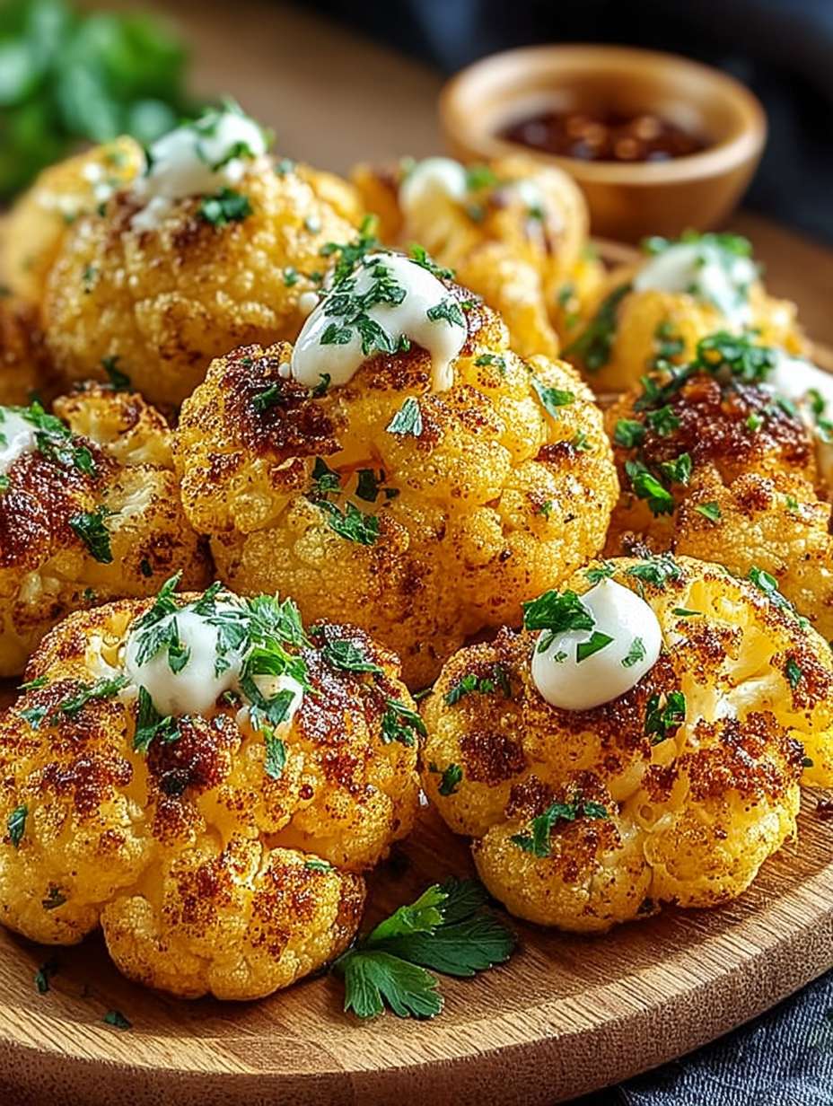 Jetzt sind Ihre WÜRZIGEN BLUMENKOHLHÄPPCHEN bereit, um genossen zu werden! Ob als Snack beim Filmabend oder als Beilage zum Grillen – diese kleinen Wunder schmecken einfach immer köstlich! Guten Appetit!