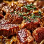Die Aromen von sanft gebratenen Zwiebeln und zartem Fleisch verbinden sich zu einem wahren Fest für die Sinne. Mit jedem Bissen dieser köstlichen Zwiebelfleisch mit Soße entfaltet sich ein harmonisches Zusammenspiel aus herzhaften, süßlichen und leicht würzigen Noten, das Sie direkt in eine kulinarische Umarmung hüllt.